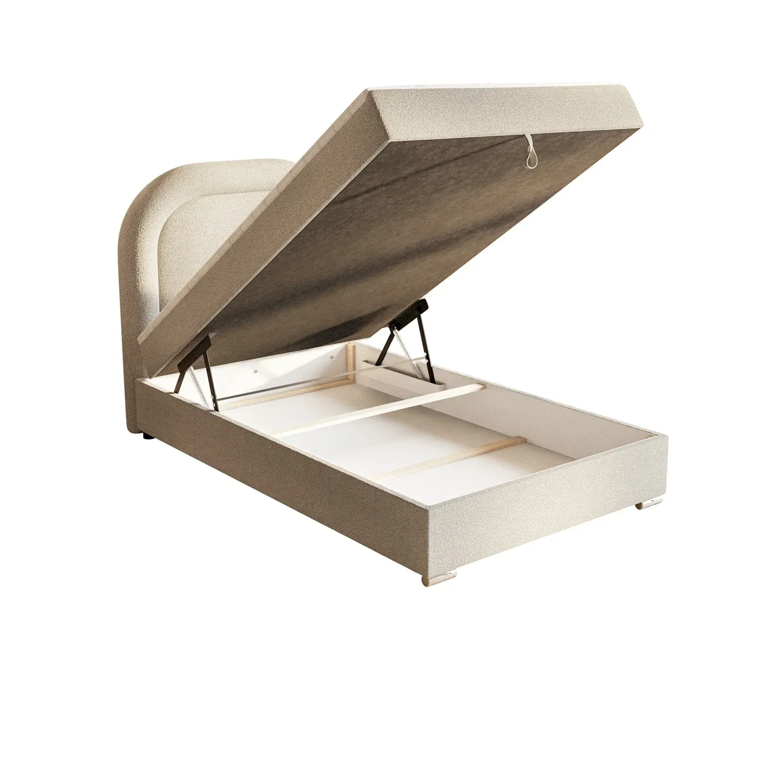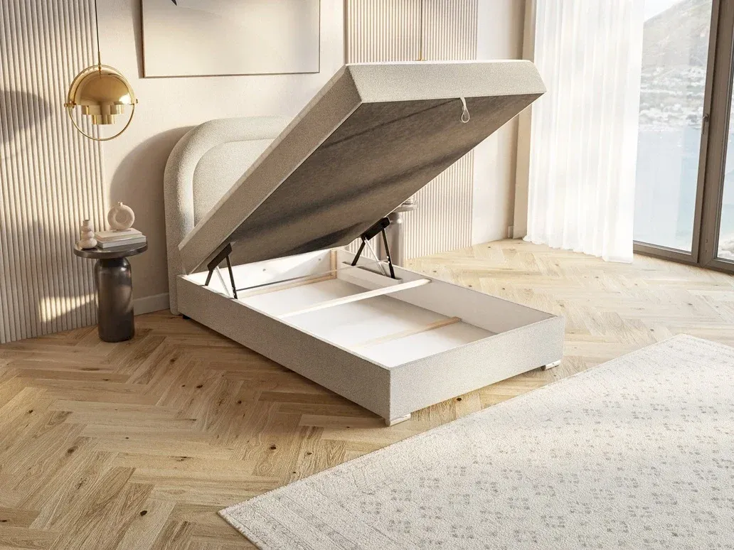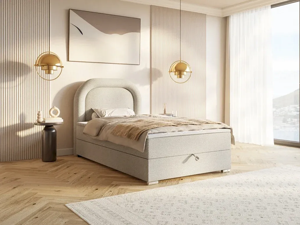 Model Bellini, prezentowany w praktycznym rozmiarze 120 cm, jest doskonałym rozwiązaniem do mniejszych sypialni, pokojów młodzieżowych lub gościnnych, gdzie liczy się każdy centymetr powierzchni. Pomimo kompaktowych wymiarów, łóżko zachowuje wszystkie atuty systemu boxspring, oferując wysoką podstawę zintegrowaną z pojemnym schowkiem na pościel, otwieranym za pomocą wygodnego uchwytu. Solidna konstrukcja osadzona na niskich, subtelnych stopkach gwarantuje stabilność i trwałość, czyniąc Bellini meblem łączącym odważny design z codzienną użytecznością.