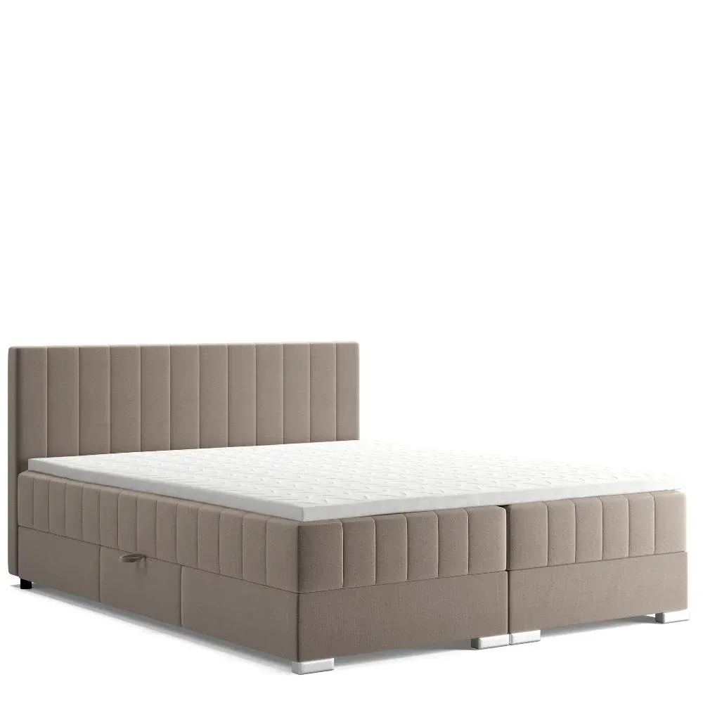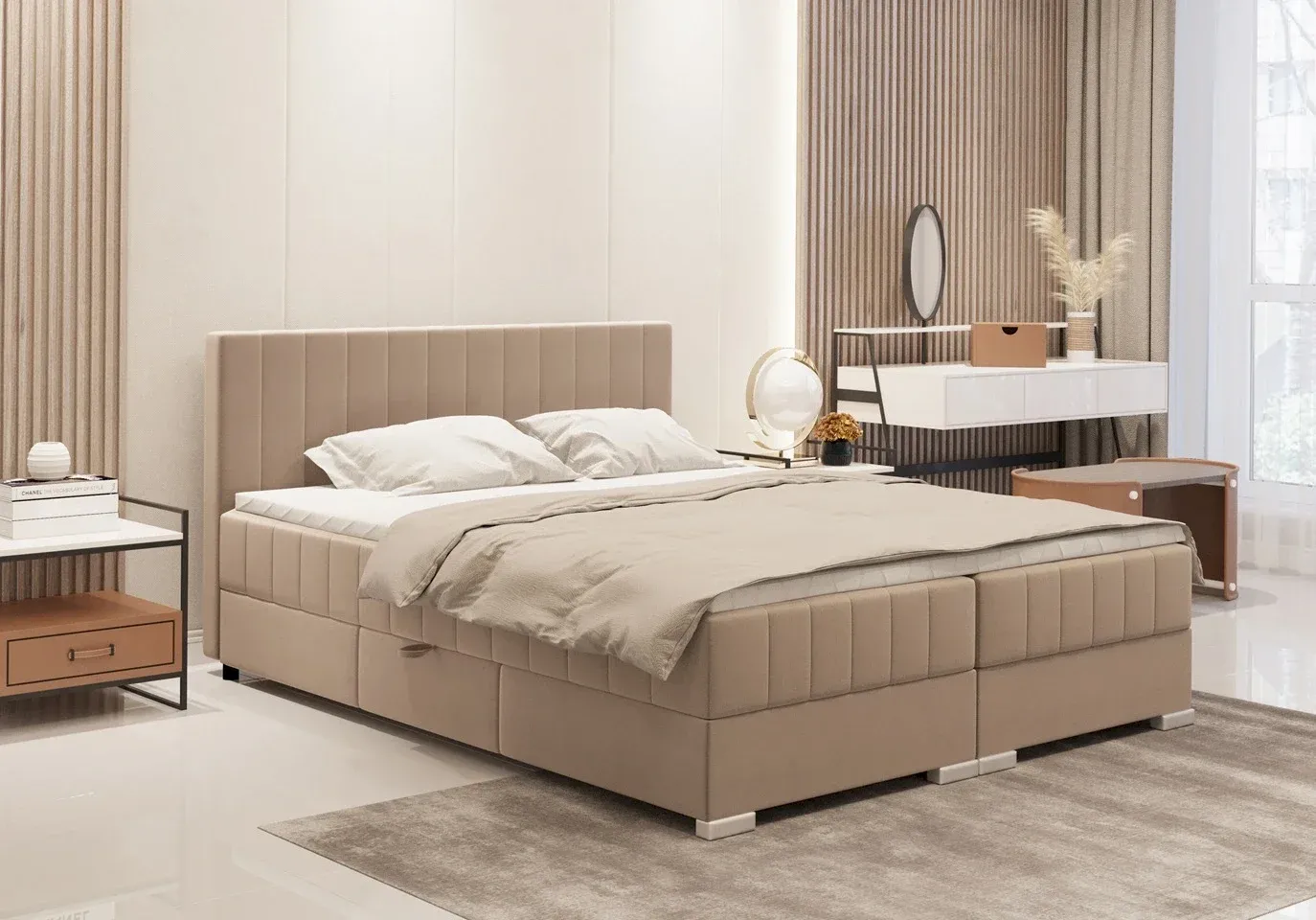 Łóżko kontynentalne Edit to synonim luksusu i funkcjonalności, zaprojektowany z myślą o najbardziej wymagających użytkownikach. Jego wielowarstwowa konstrukcja typu Boxspring nie tylko gwarantuje nieprzeciętny komfort snu, ale również nadaje sypialni prestiżowy wygląd hotelowego apartamentu. Kluczowym elementem wizualnym jest wysokie, smukłe wezgłowie zdobione precyzyjnymi, pionowymi przeszyciami, które wprowadzają do wnętrza ład, elegancję i nowoczesny rytm.