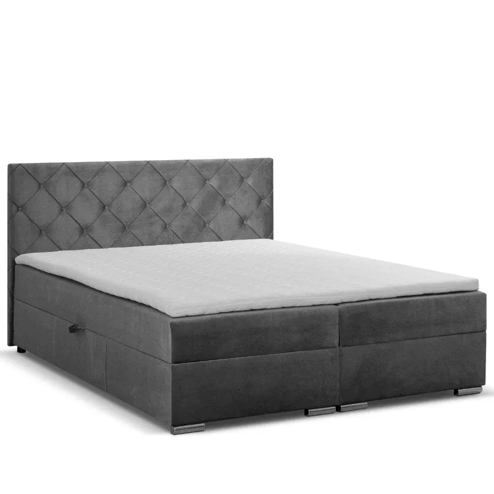 Model Malaga został zaprojektowany w systemie boxspring, co gwarantuje nie tylko imponującą wysokość spania, ale także optymalne wsparcie dla kręgosłupa dzięki wielowarstwowej strukturze. Funkcjonalność łóżka podnoszą zintegrowane pojemniki na pościel, do których dostęp ułatwiają zamontowane uchwyty, co czyni ten mebel idealnym rozwiązaniem dla osób ceniących porządek i ergonomię. Solidna, tapicerowana podstawa osadzona na niskich, chromowanych stopkach zapewnia stabilność i podkreśla prestiżowy wygląd mebla.