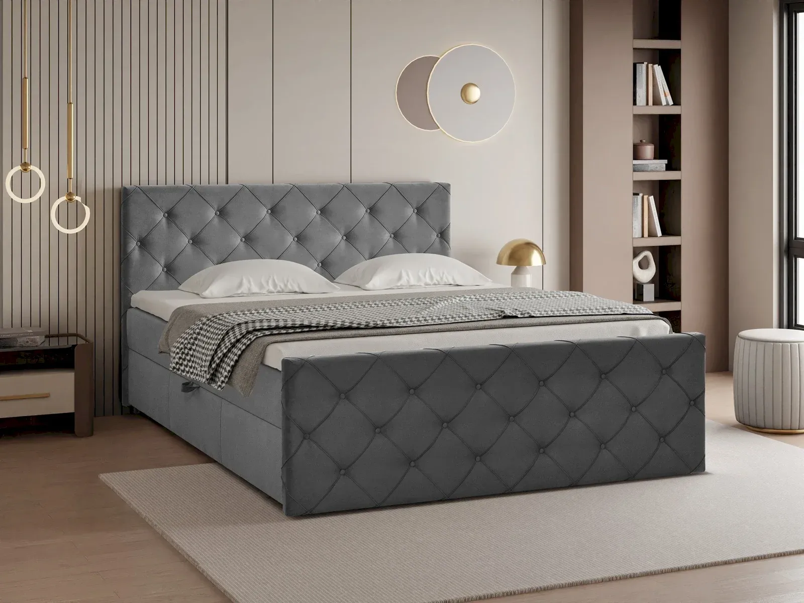 Łóżko kontynentalne Heaven to projekt, który wnosi do sypialni atmosferę ekskluzywnego spokoju i ponadczasowej elegancji. Model ten charakteryzuje się wyjątkową spójnością wizualną – klasyczne pikowanie w romby, zdobione subtelnymi guzikami, zostało zastosowane zarówno na wysokim wezgłowiu, jak i na froncie łóżka. Taka lustrzana kompozycja detali nadaje bryle luksusowego sznytu i sprawia, że mebel prezentuje się nienagannie z każdej perspektywy.