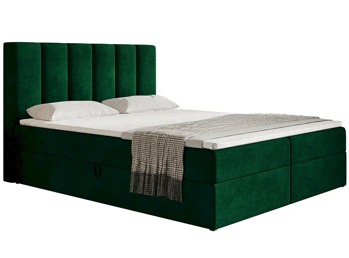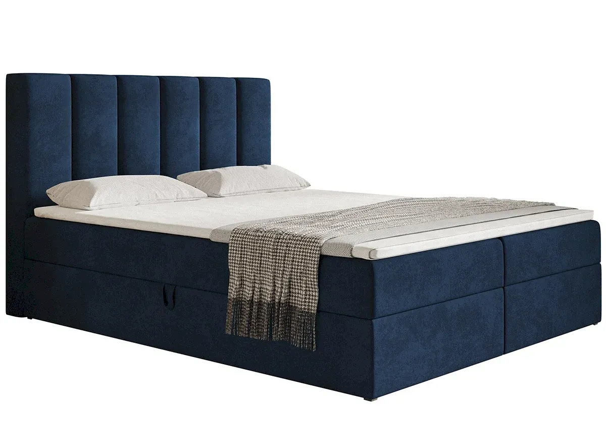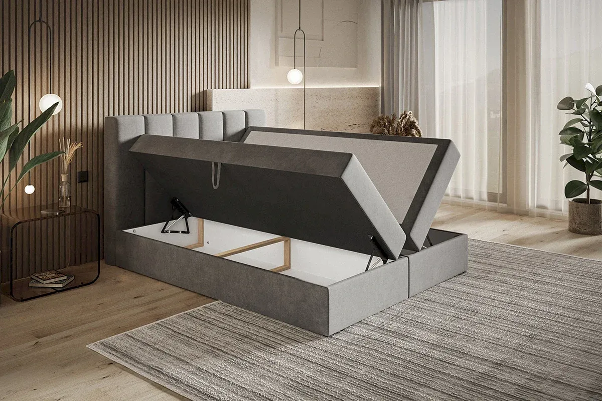 Model Box 1 został zaprojektowany w oparciu o solidną konstrukcję typu boxspring, charakteryzującą się wysoką podstawą skrywającą przestronne schowki na pościel. Gładka, jednolita rama łóżka stanowi spokojną przeciwwagę dla dekoracyjnego zagłówka, tworząc spójną i elegancką całość. Dzięki optymalnej wysokości siedziska, wstawanie z łóżka jest wyjątkowo komfortowe, co czyni model Box 1 idealnym wyborem dla osób poszukujących ergonomii w luksusowym wydaniu.