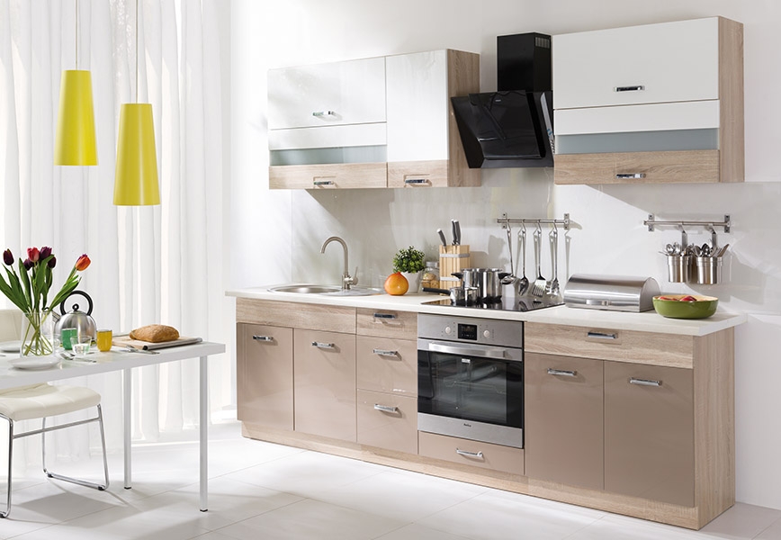 Premio to meble systemowe, co oznacza pełną swobodę aranżacji. Szeroki wybór brył – od szafek pod zabudowę sprzętu AGD, przez pojemne szuflady, aż po witryny – pozwala na zagospodarowanie każdej kuchni, niezależnie od jej metrażu. Szafki dolne osadzone są na regulowanych nóżkach, które ułatwiają precyzyjne wypoziomowanie ciągu meblowego oraz są ukryte za cokołem, co ułatwia utrzymanie czystości podłogi.