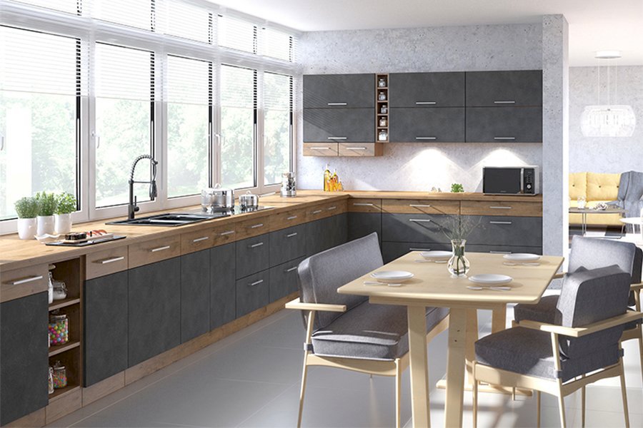 Wizytówką tej kolekcji jest unikalna kolorystyka frontów. Zastosowano tutaj dekor Matera, który wiernie imituje strukturę ciemnoszarego betonu lub grafitowego kamienia. Matowa powierzchnia frontów jest nie tylko efektowna, ale również praktyczna – na strukturze betonu ewentualne zabrudzenia czy smugi są znacznie mniej widoczne niż na gładkich, jednolitych powierzchniach.