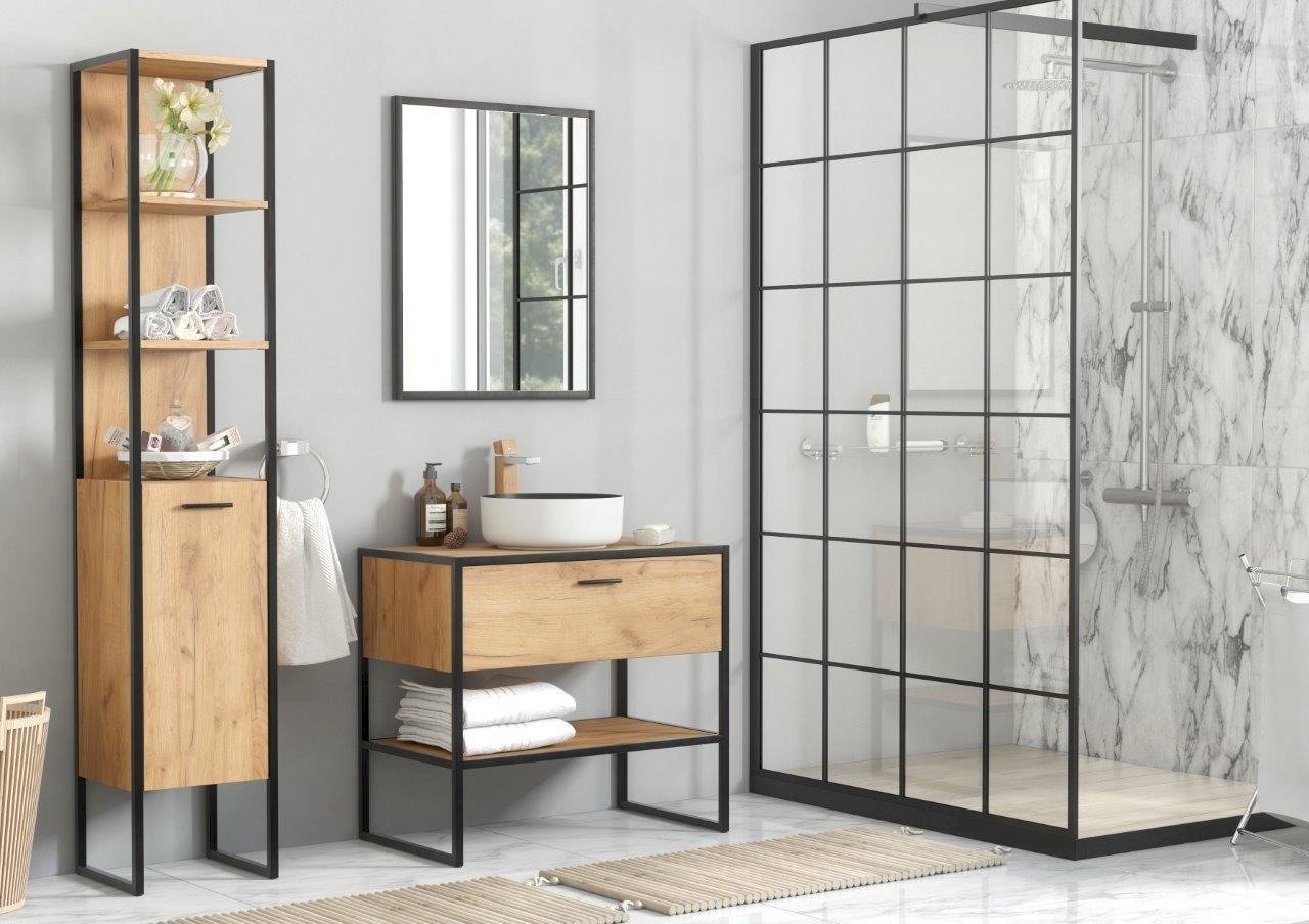 Kolekcja Brooklin to doskonały wybór dla osób, które chcą stworzyć w swojej łazience wyjątkową atmosferę – surową, ale przytulną. Czarne, metalowe stelaże i naturalne fronty z wyraźnym rysunkiem drewna tworzą kompozycję, która przyciąga wzrok i nadaje wnętrzu indywidualnego charakteru. To meble, które nie tylko podkreślą loftowy styl aranżacji, ale także zapewnią wygodę i porządek na co dzień.
